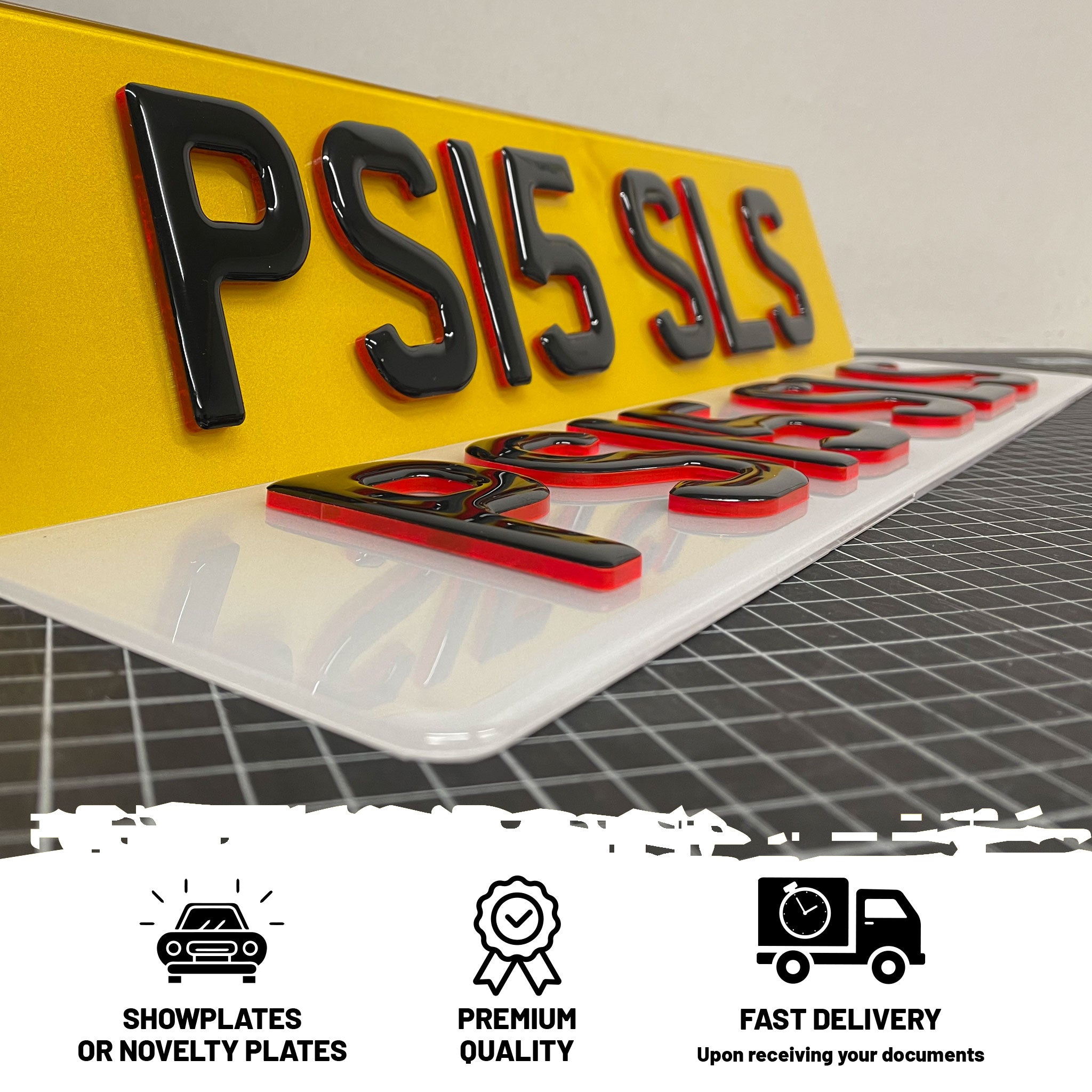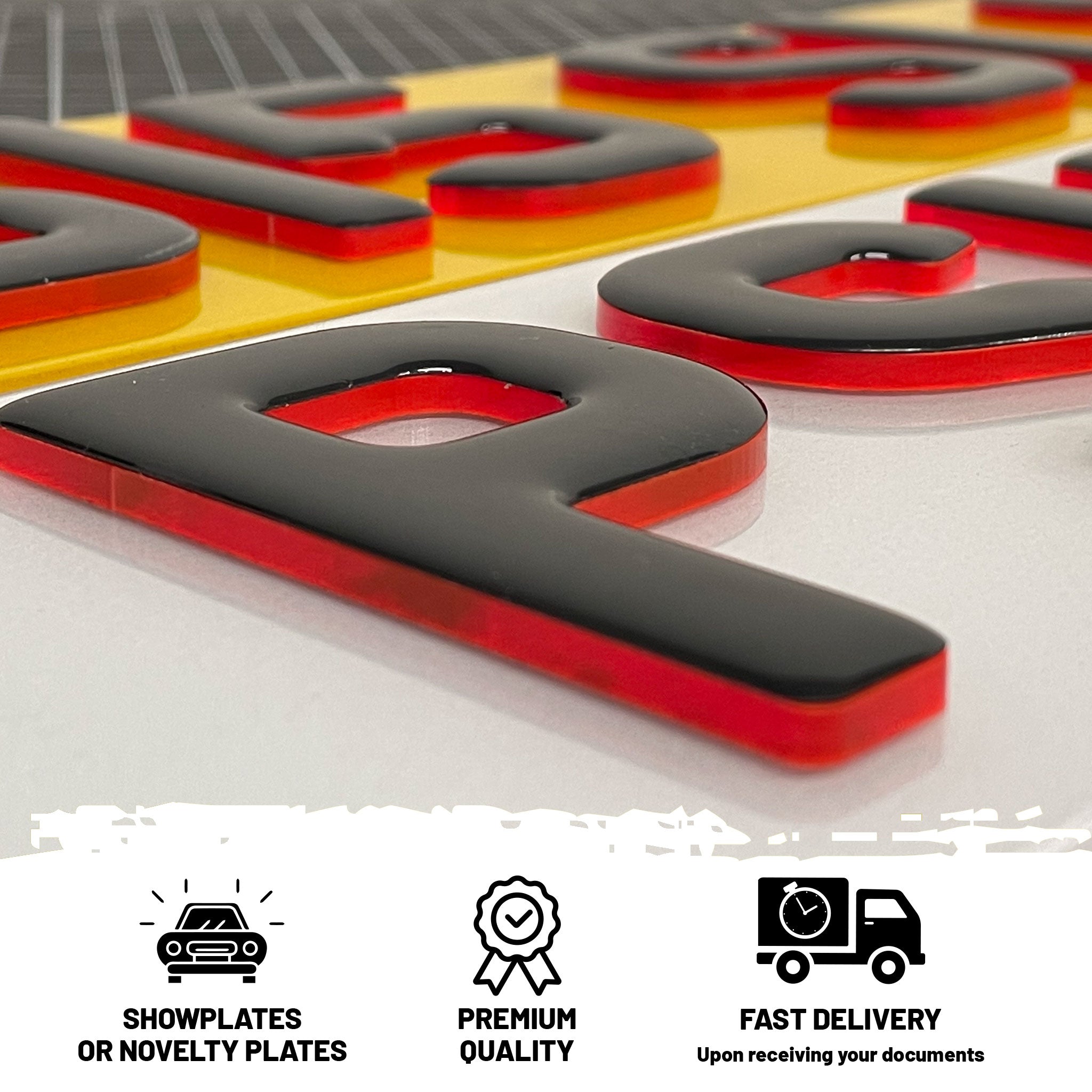 These 4D Neon Red characters with a height of 3mm topped with a 3D gel resin character give a domed effect to your number plate.