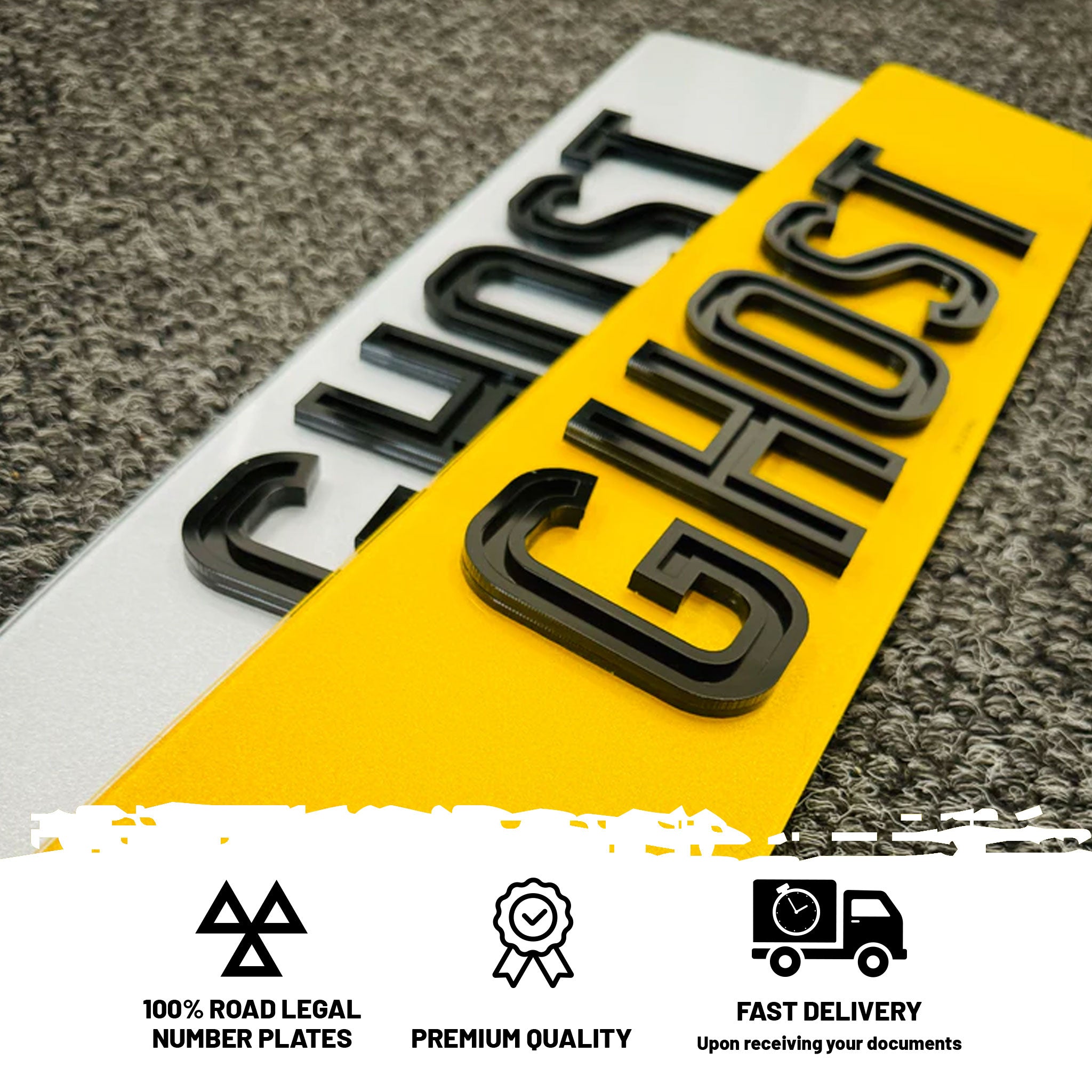 Our Ghost acrylic number plates are a class above the rest. They are made using a 3mm letter with a 3mm outline on top. Please note our ghost plates DO NOT mean they cannot be detected by cameras these plates are road legal and we do not do any anti camera plates.  We cut our letters using the latest laser technology for precision and use a strong 3M adhesive backing. All letters are created using quality acrylic to give that high gloss sleek finish and all at a very competitive price.