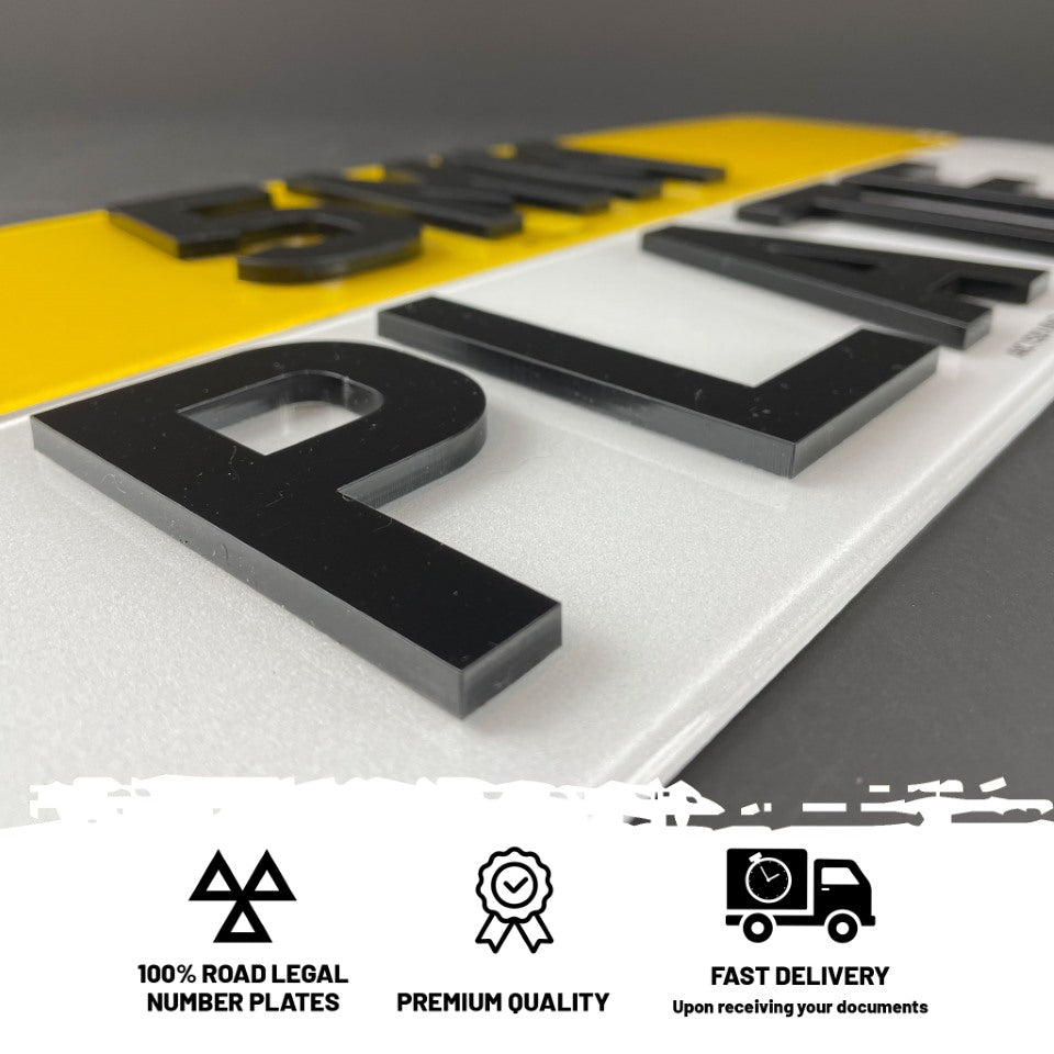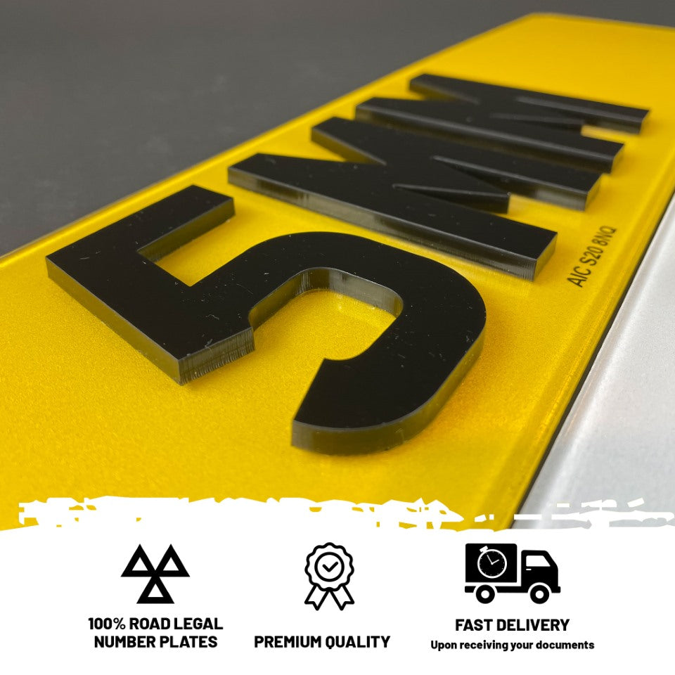 Set of premium 4D Gloss Black 5mm number plates laser cut to perfection. Manufactured using cutting-edge laser technology in-house, these are the latest bespoke number plates currently on-trend. This makes our UK Road legal number plates the perfect upgrade. These plates will come with printed manufacturer information and a BSAU 145e stamp for peace of mind.